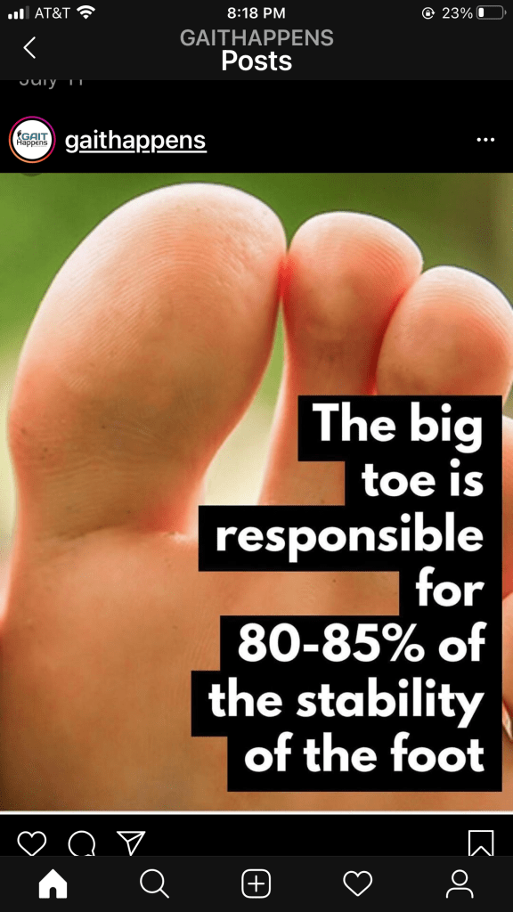 Finally the big toe is very important for your structure. Keep this in mind and make sure to wear shoes with a wide toebox. The big toe is our most important toe, but it is also the one that is most injured and deformed by modern shoes. You may have to buy different shoes, but these are becoming more common. Most modern shoes crush the feet and ruin our mobility. I provide some more info and links below.