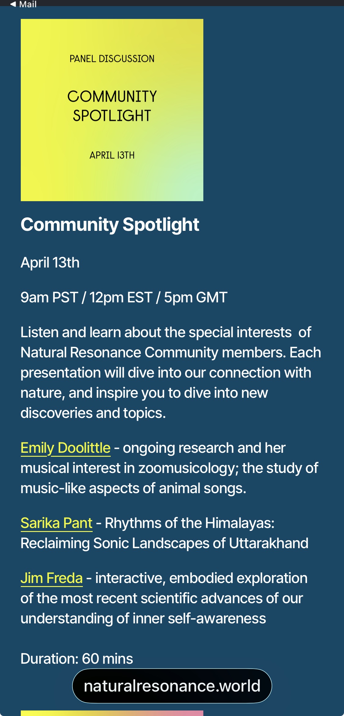Schedule: https://www.naturalresonance.world/2026-nrf-events